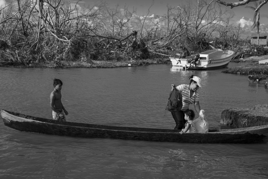 Una hilera de lanchas de motor traslada a oficiales del Éjercito de Nicaragua mientras custodían láminas de zinc, agua y plantas hacia distintas comunidades. Es la poca ayuda de emergencia que llega a las comunidades. Una libra de clavos, entre 15 y 20 láminas de zinc como parte del Plan Techo o kit de cocina, es parte de lo que las autoridades de Nicaragua han entregado a las familias damnificadas. Para las familias esta ayuda además de escasa se vuelve innecesaria ante las necesidades reales: madera para levantar los pilares que sostengan el zinc, clavos, agua, comida, atención médica, ropa, entre otros.