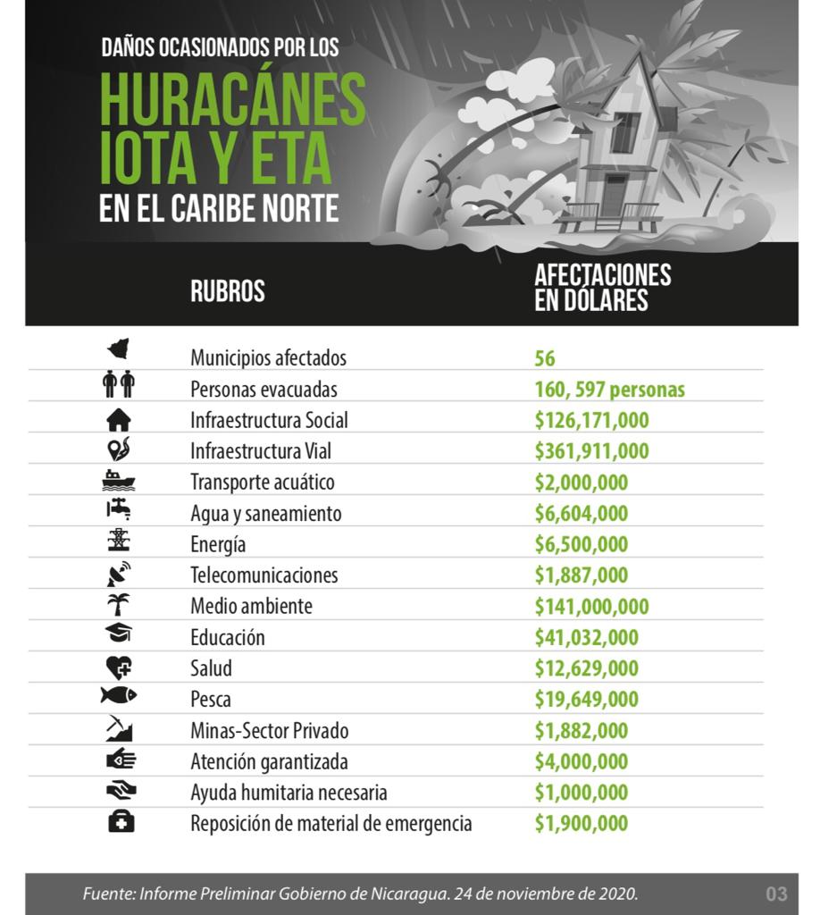 Ivania y su familia son parte de los tres millones de personas que fueron afectadas por los huracanes, según el informe preliminar de daños materiales emitido por el régimen de Daniel Ortega, el 24 de noviembre de 2020. A tres meses del paso de estos huracanes no se conocen datos exactos sobre las comunidades afectadas y la magnitud de los daños. El gobierno estimó las pérdidas económicas en 742 millones 671 mil dólares, distribuidos entre daños totales acumulados, pérdidas económicas y necesidades de atención.
