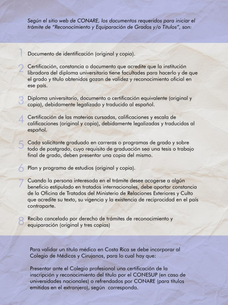 Según el sitio web de CONARE, los documentos requeridos para iniciar el trámite de “Reconocimiento y Equiparación de Grados y/0 Títulos”, son: