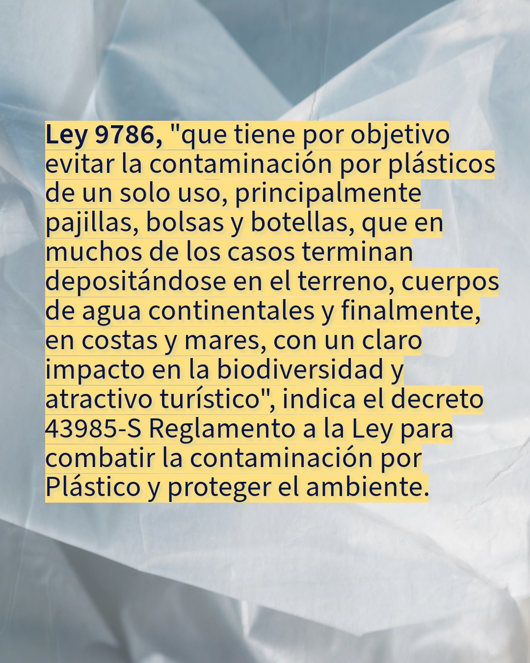 La iniciativa culminó con la aprobación de la Ley N° 9786 en 2019, que prohíbe el uso de pajillas y bolsas plástica en comercios, reservas forestales, centros turísticos, etcétera.