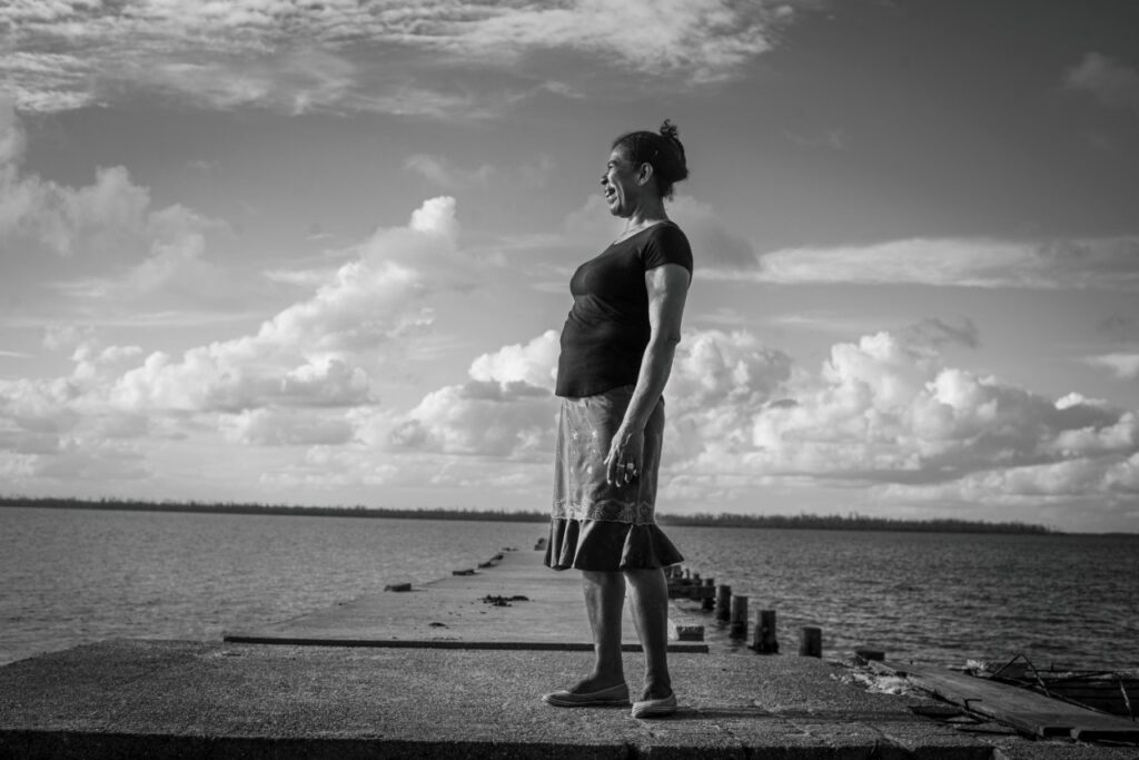 La mujer que posa para el fotoperiodista Oscar Navarrete, es Marta Morza. Mientras es retratada mira con alegría y satisfacción hacía el horizonte sobre el muelle que resistió los embates de los huracanes Eta e Iota.