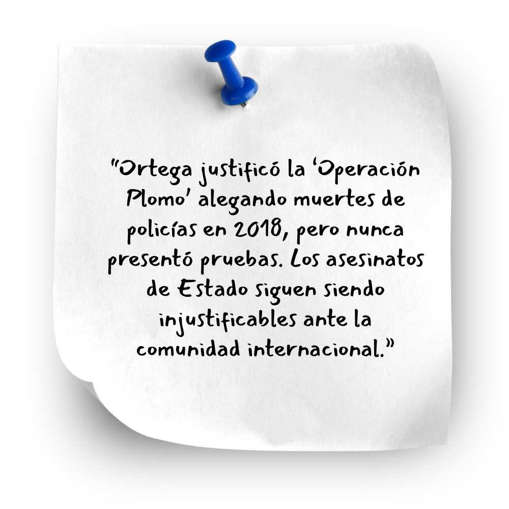 Los asesinatos de Estado cometidos por fuerzas policiales, militares y paramilitares (2018 – 2022) han sido injustificables ante la comunidad internacional, sin embargo, Daniel Ortega, argumenta públicamente que la «Operación Plomo» que ordenaba a su militancia disparar contra civiles en las protestas se justificaba por Los supuestos asesinatos de policías cometidos por civiles durante las mismas, hasta la fecha Daniel Ortega no ha presentado pruebas sobre esas aseveraciones.