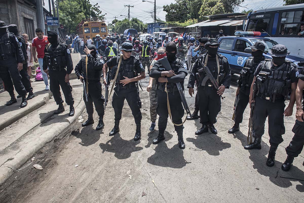 Y reforzó a la fuerza policial con armamento militar hasta tomarse las calles, reprimieron las protestas y aún así la ciudadanía siguió resistiendo y gritando: «NO TENEMOS MIEDO» «NOS TIENEN MIEDO PORQUE NO TENEMOS MIEDO» y derribaron los símbolos de la dictadura, se levantaron trincheras, marchas, piquetes y bailes demostraban que: por las y los secuestrados y encarcelados, por las y los asesinados, por las y los desaparecidos, por la represión y persecución a los y las periodistas, por la CORRUPCIÓN  ¡NICARAGUA EXIGE JUSTICIA!